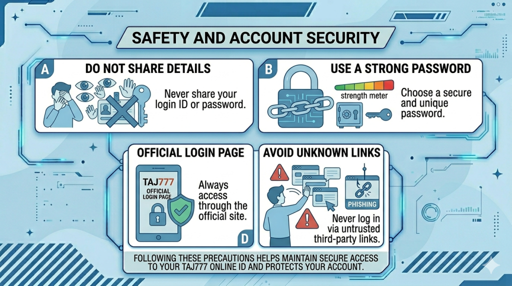 Following these precautions helps maintain secure access to your TAJ777 online ID and protects your account from potential risks. 🔐