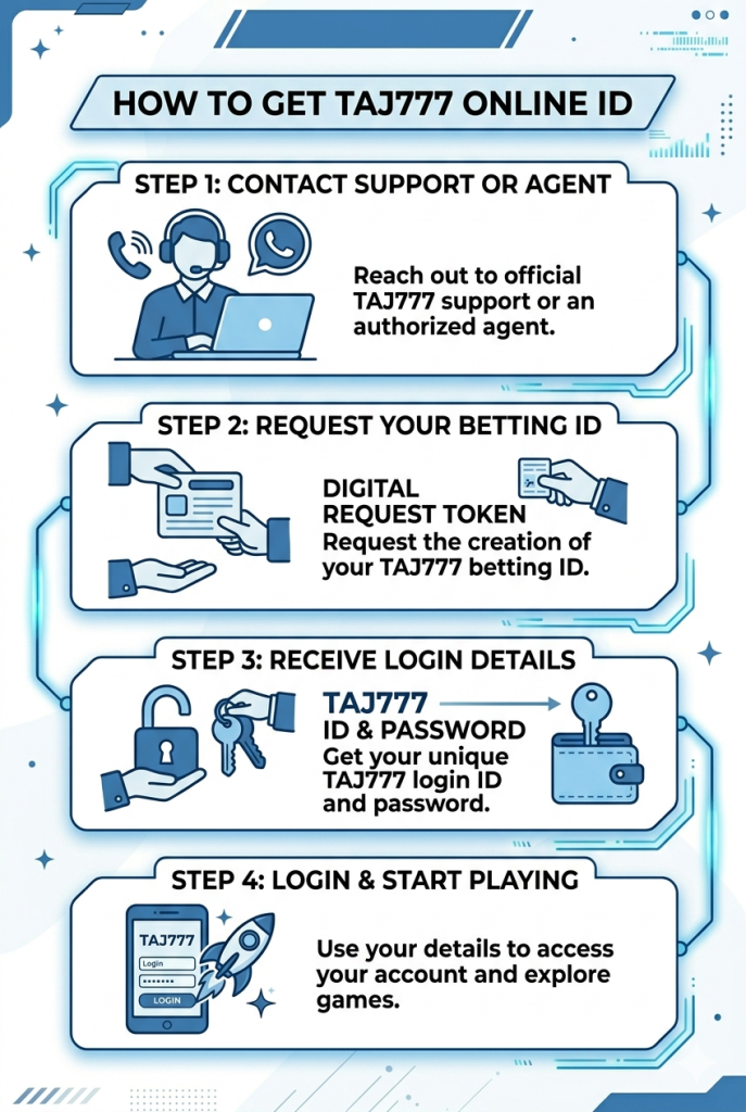 Getting a TAJ777 online ID is a quick and simple process. Unlike many platforms that require long registration forms, TAJ777 accounts are usually created through an agent or WhatsApp support.